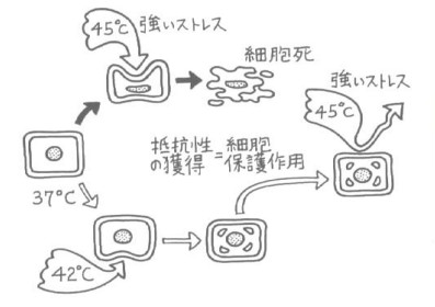 人間の細胞は、45℃の高温では通常耐えられずダメージを受けますが、体温の限界近くの42℃程度の温熱刺激を受けると、細胞内で複数のHSPが発現して、ストレスに強い細胞に変わることがわかっています。